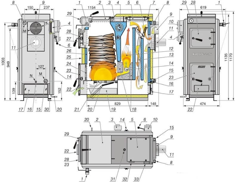 Твердопаливний котел Калвіс 2-16 відноситься до водогрійних котлів нижнього горіння, працює на твердому паливі. Основним паливом є деревина, допоміжне – відходи деревини, брикет, торфобрикет або кам'яне вугілля. Завдяки місткій топці забезпечується тривале горіння однієї закладки (середній час горіння 4–8 годин). Всі котли нижнього горіння комплектуються регуляторами тяги виробництва ESBE (Швеція), які призначені для підтримки встановленої температури котла. Внутрішні стінки котлів виготовлені з листової сталі товщиною 6 мм, що збільшує термін служби котлів. Середній срок експлуатації складає 15–20 років.