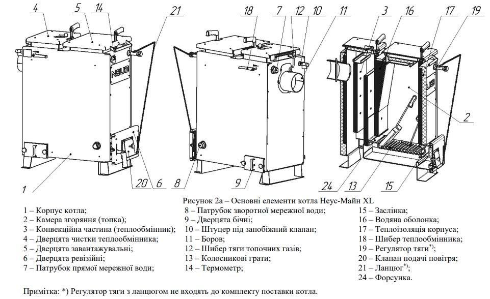 - Котел оснащений чавунними колосниками, що робить його більш стійким до високих температур, а також має форсунку для рівномірного розподілу повітря в зоні горіння, що сприяє більш повному спалюванню палива.