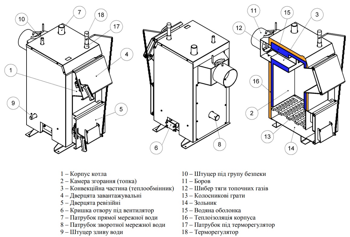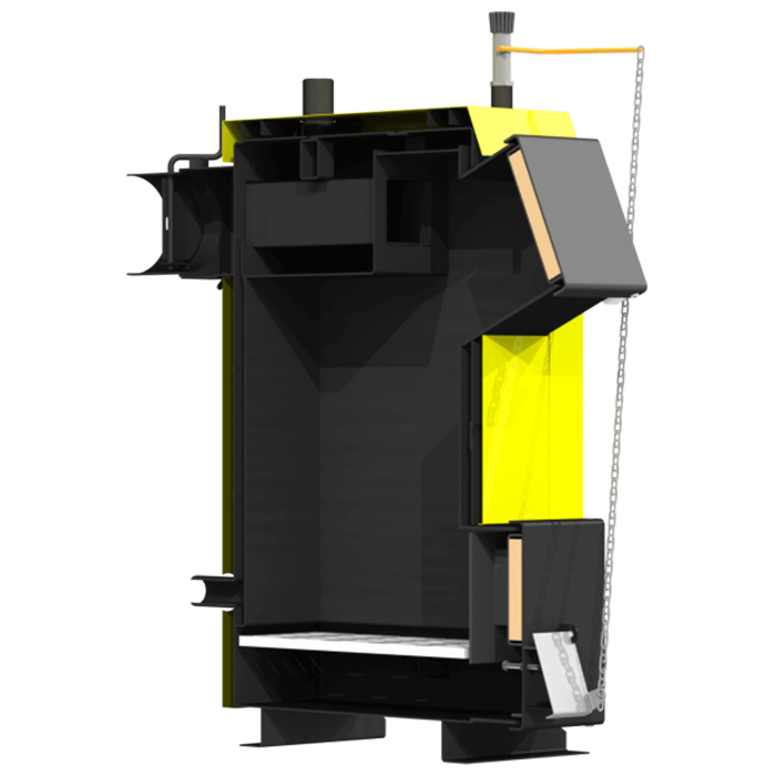 - Дверцята для обслуговування — окремо для теплообмінника, завантаження та зольника.