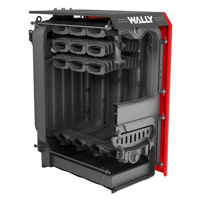Чавунні твердопаливні котли Klimosz WALLY S мають одну з найбільш ефективних конструкцій теплообмінника (над камерою спалювання є три ряди водяних полиць). Крім того, товщина стінки чавуну складає до 12 мм - що забезпечує набагато більшу надійність і довговічність роботи в порівнянні з конкурентами. Великий завантажувальний отвір дверей (40 см * 36 см) дозволяє завантажувати великі шматки деревини. Сам теплообмінник котлів Wally від відомого польського виробника Klimosz спроектований і виливається в Італії. Між декоративною обшивкою і теплообмінником перебуває шар ефективної теплоізоляції, що дозволяє додатково зберігати тепло і максимально ефективно передавати його в систему опалення. Корпус котла практично не нагрівається.
