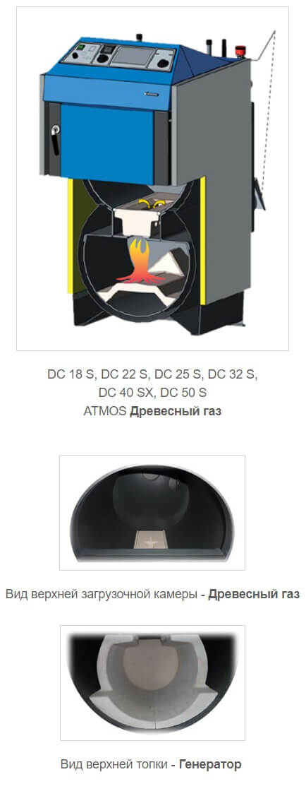 Котли на дровах газогенераторні Atmos DC S призначені для спалювання деревини. Оснащені великим бункером для палива, витяжним вентилятором, контуром охолодження для захисту від перегріву, термостатом для димових газів. Відрізняються високою якістю, невеликим розміром і вагою, високим ККД, зручністю збору золи, екологічністю.