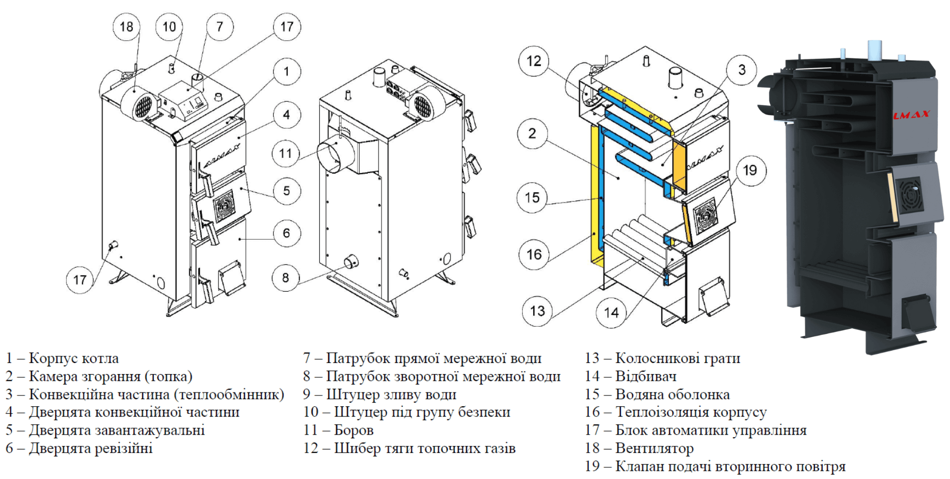 - Корпус котла: виготовлений з подвійними стінками з водяними перегородками, що дозволяє витримувати високі температури та збільшує термін служби котла.