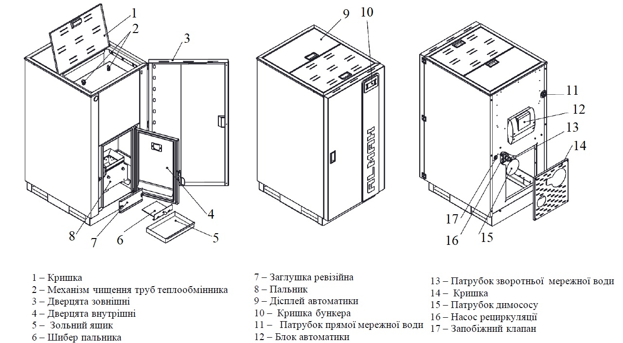 Основні елементи котла, такі як пальник, двигуни і система автоматичної подачі палива, легко доступні для обслуговування, що забезпечує комфортне і безпечне використання.