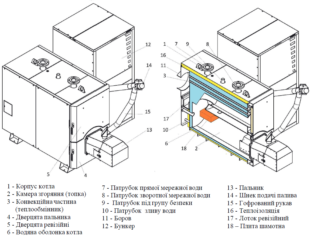 Корпус виконаний зі зварених сталевих обичайок із подвійними стінками, розділеними водяними перегородками, та обгорнутий високоякісною теплоізоляцією.