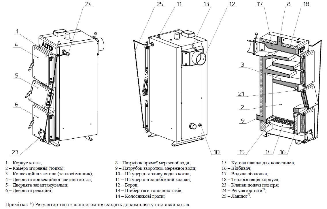- Димохід розташований горизонтально в верхній частині котла і обладнаний шибером для регулювання тяги, що дозволяє контролювати процес горіння та оптимізувати роботу котла.