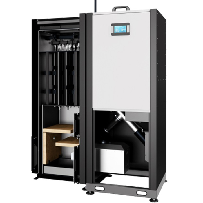 Котел працює на деревинних пелетах, має автоматичну подачу палива, авторозпалювання, автоматичне затухання та підтримання температури без постійного втручання користувача.