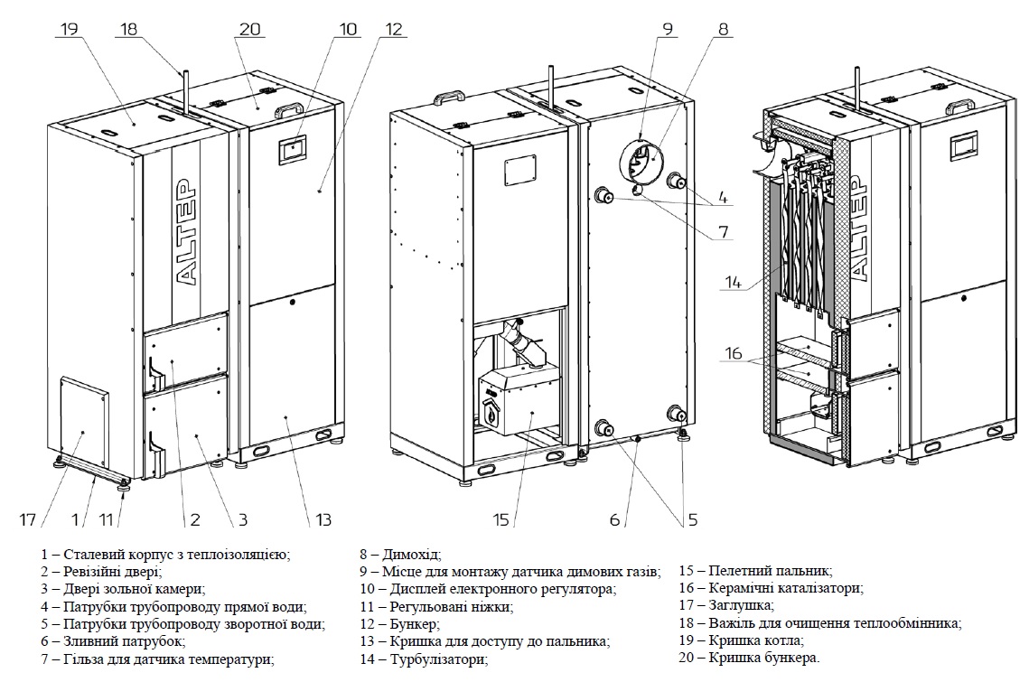 ALTEP PELLETS A (АЛЬТЕП ПЕЛЕТС А) 15/20/25/30 кВт — тип «КТ-2Е-PG», автоматизований пелетний котел зі сталлю 6 мм і ККД до 93%.