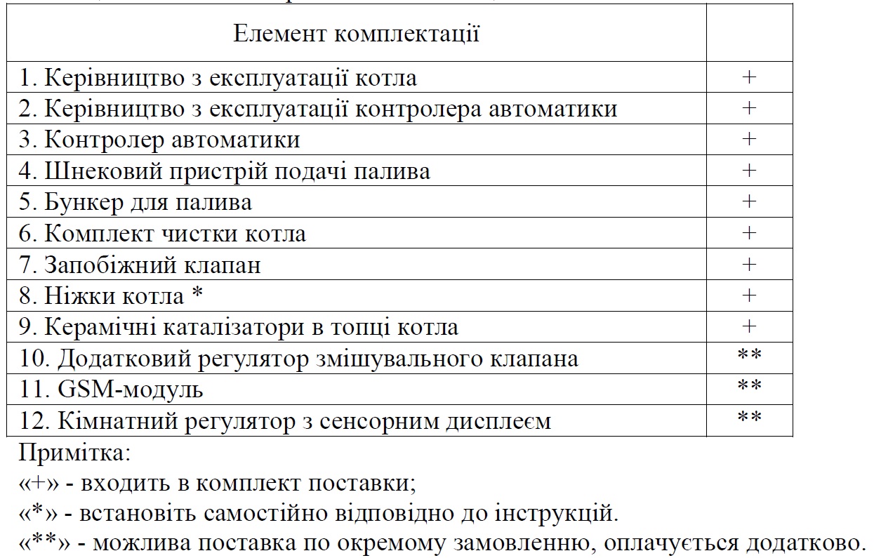 У котлі встановлено факельний пелетний пальник, який спалює паливо на рухомому колоснику з жароміцної сталі. Подача пелет із зовнішнього бункера здійснюється автоматично за допомогою шнекового механізму, який під’єднується до пальника гофрованим термозахищеним рукавом.