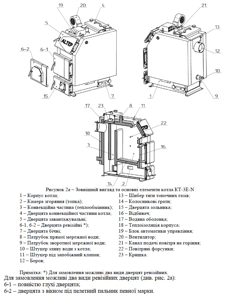 Гаряче повітря проходить через теплообмінник, нагріваючи воду у водяній оболонці. Продукти згоряння виводяться через димохід з вбудованим шибером. Для зручного очищення передбачено зольник та ревізійні дверцята з трьох боків.