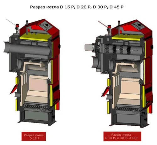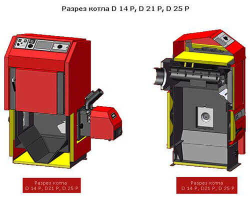 Твердопаливні котли Atmos D14P, D20P, D21P, D25P, D30P, D40P, D50P в якості палива використовують деревні пелети. Подача палива для згоряння відбувається за допомогою шнекового конвеєра, який може розташовуватися як з правого, так і з лівого боку котла. В якості паливного контейнера можна використовувати спеціальні бункери (стандартні обсяги 250, 500 і 1000л) або ж частина спеціально обладнаній кімнати.