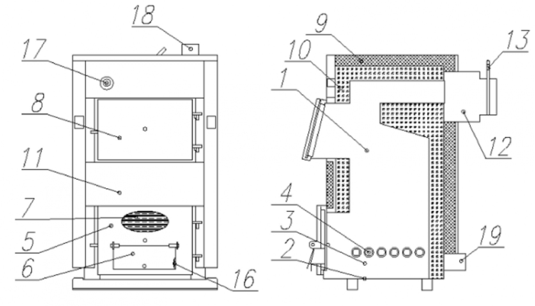 1 – топка котла; 2 – днище; 3 – зольник; 4 – колосник, наповнений водою; 5 – дверцята; 6 – заслінка подачі повітря; 7 – захисні дверцята; 8 – дверцята для завантаження палива; 9 – теплоізоляційний лист; 10 – водяна сорочка теплообмінника; 11 – декоративний кожух; 12 – димохідний патрубок; 13 – шиберная заслінка; 14 – механічний регулятор тяги (опція) *; 15 – ланцюжок *; 16 – кріплення для регулятора тяги; 17 – термометр; 18 – патрубок відводу води (вихід) 19 – патрубок підведення води (вхід).