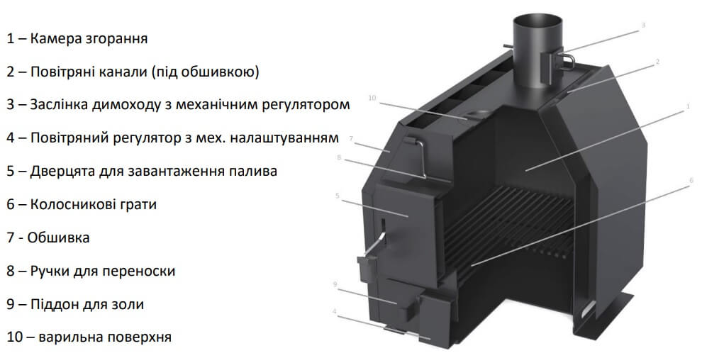 Матеріал виготовлення – сталь 3 мм. Відрізняється компактним розміром, пофарбована вогнетривкою фарбою. Булер’ян оснащений зручними ручками для його переміщення. Для регулювання надходження повітря є шибер тяги і механічний регулятор піддуву з фіксатором.