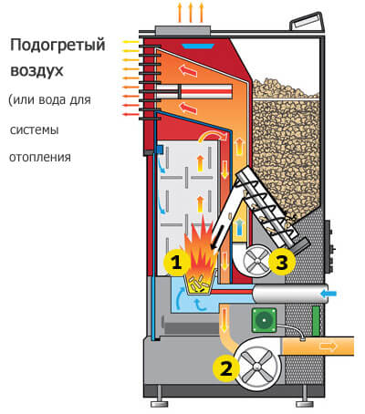 Вентилятор піддуву всмоктує повітря з кімнати, який проходить через котушку електророзпалу в камеру згоряння, запалюючи пелети приблизно через 10 хвилин після включення печі. Через 15-20 хвилин, електророзпал вимикається, в той час як шнек продовжує подавати пелети в працюючу камеру згоряння. Той же канал вентилятора забирає димові гази через димохід на вулицю. Підігріте, бездимне повітря надходить в приміщення і забезпечує її необхідною температурою (В разі водогрійного типу печі, замість підігрітого повітря, вода надходить в систему опалення).