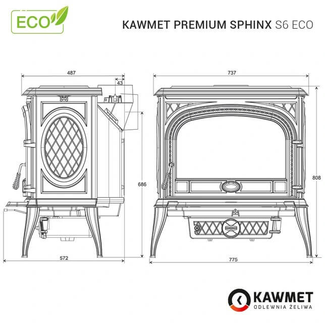 KAWMET Premium SPHINX S6 ECO відповідає європейським нормам екодизайну, які обмежують викиди шкідливих речовин, таких як тверді частинки, оксиди азоту та оксиду вуглецю, роблячи піч екологічно безпечною.