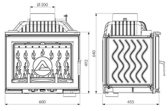 Дана камінна топка має функціональну і просунуту конструкцію, яка має ряд елементів, що вигідно відрізняють її від аналогів. Вона оснащена системою допалювання димових газів (1), що впливає на збільшення ефективності її роботи. Система "чисте скло" (2) перешкоджає забрудненню і закопчений поверхні скла, саме ж скло є жароміцним. Система "холодна ручка" запобігає нагрів ручки під час роботи апарату. Також топка оснащена шибером (3) і дефлектором (4). Подача повітря регулюється за допомогою зольника (5). Є система припливу зовнішнього повітря (6). Корпус топки захищається від зносу завдяки додатковій жаростійкої плиті (7). Дрова утримуються всередині топки за допомогою декоративної решітки (8). Щоб збільшити площу тепловіддачі радіатори в даній камінній топці розташовані досить щільно.
