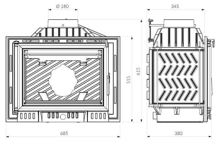 Додаткові елементи: Жаростійка плита захищає корпус, декоративна решітка запобігає випаданню дров, а регульований зольник контролює подачу повітря. Щільно розташовані радіатори збільшують тепловіддачу.