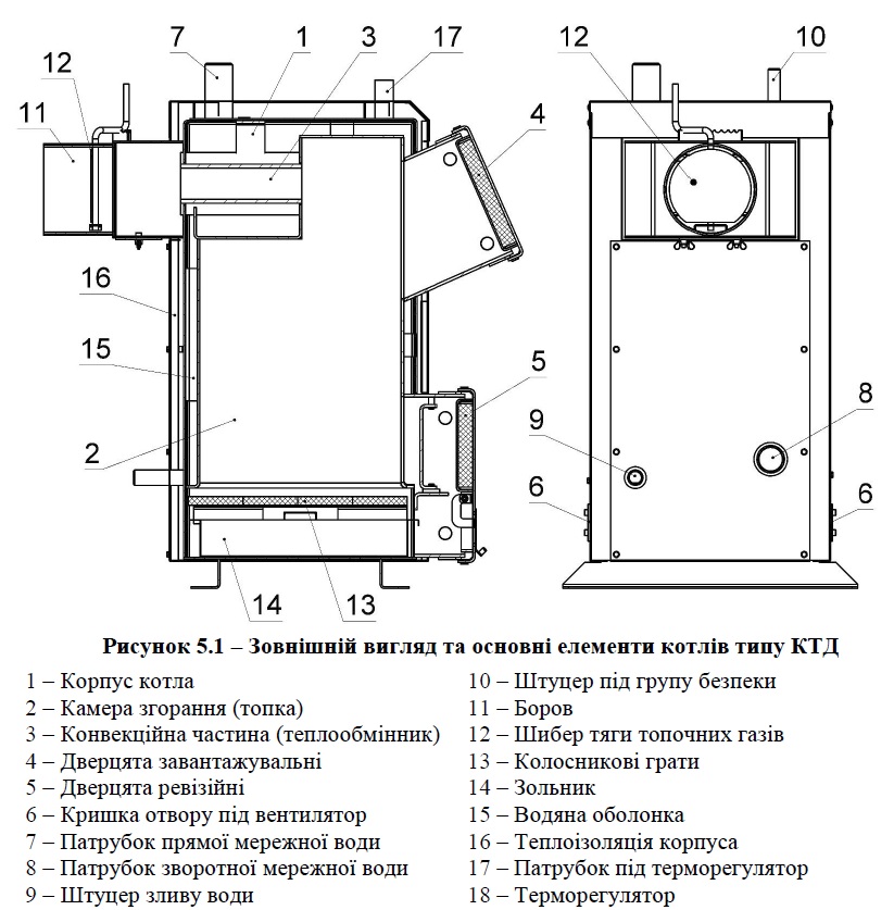 Корпус котла виготовлений із жаростійкої котлової сталі товщиною 5 мм, що забезпечує ресурс експлуатації понад 12–15 років. Внутрішній простір поділений на камеру згоряння та теплообмінну зону, розмежовані водяними перегородками. Завдяки цьому забезпечується ефективна передача тепла до теплоносія, що циркулює по оболонці.