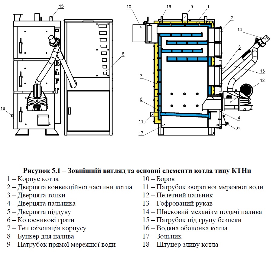 Пальник факельного типу працює на рухомому колоснику з жаростійкої сталі та може бути замінений на інший за бажанням користувача. Камера згоряння облицьована вогнетривкою керамікою. Зола автоматично осідає в зольник, який легко очищується. Очистка теплообмінника та видалення золи проводиться кожні 10–14 днів. Завантаження палива в бункер — раз на кілька днів.