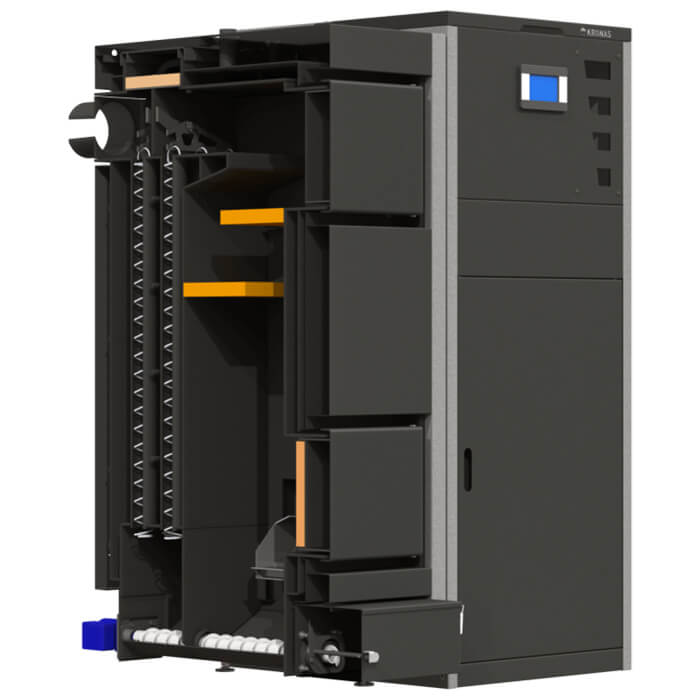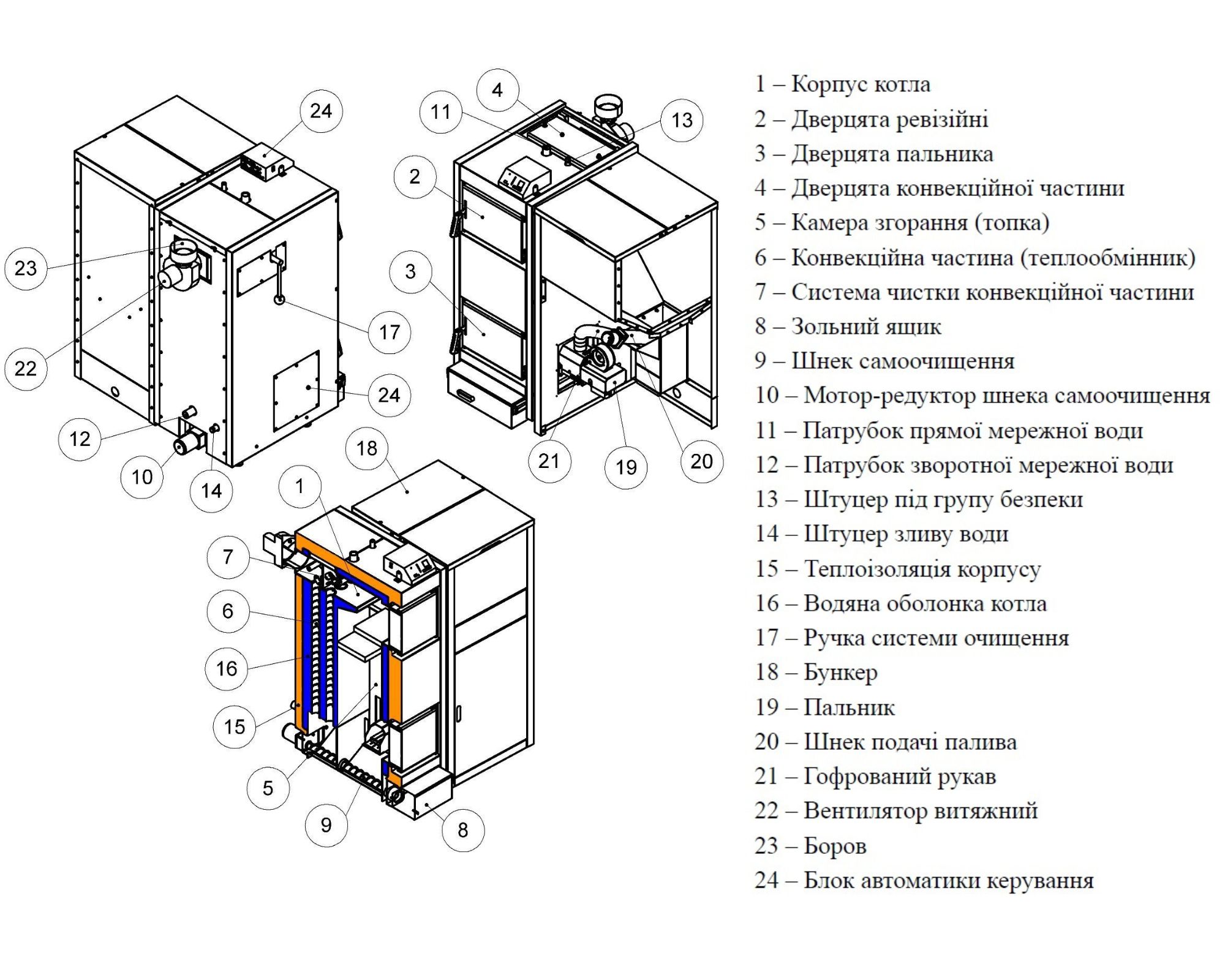 Котел складається з корпусу, камери згоряння та системи автоматичної подачі палива. Камера згоряння виготовлена з жароміцної сталі та оснащена вогнетривкою керамікою для підвищення стійкості до високих температур. Зола, що утворюється під час горіння, автоматично видаляється за допомогою зольного шнека, який працює від мотор-редуктора. Контролер котла проводить постійні вимірювання температури води і, на основі цих даних, керує автоматичною подачею палива та роботою вентилятора.