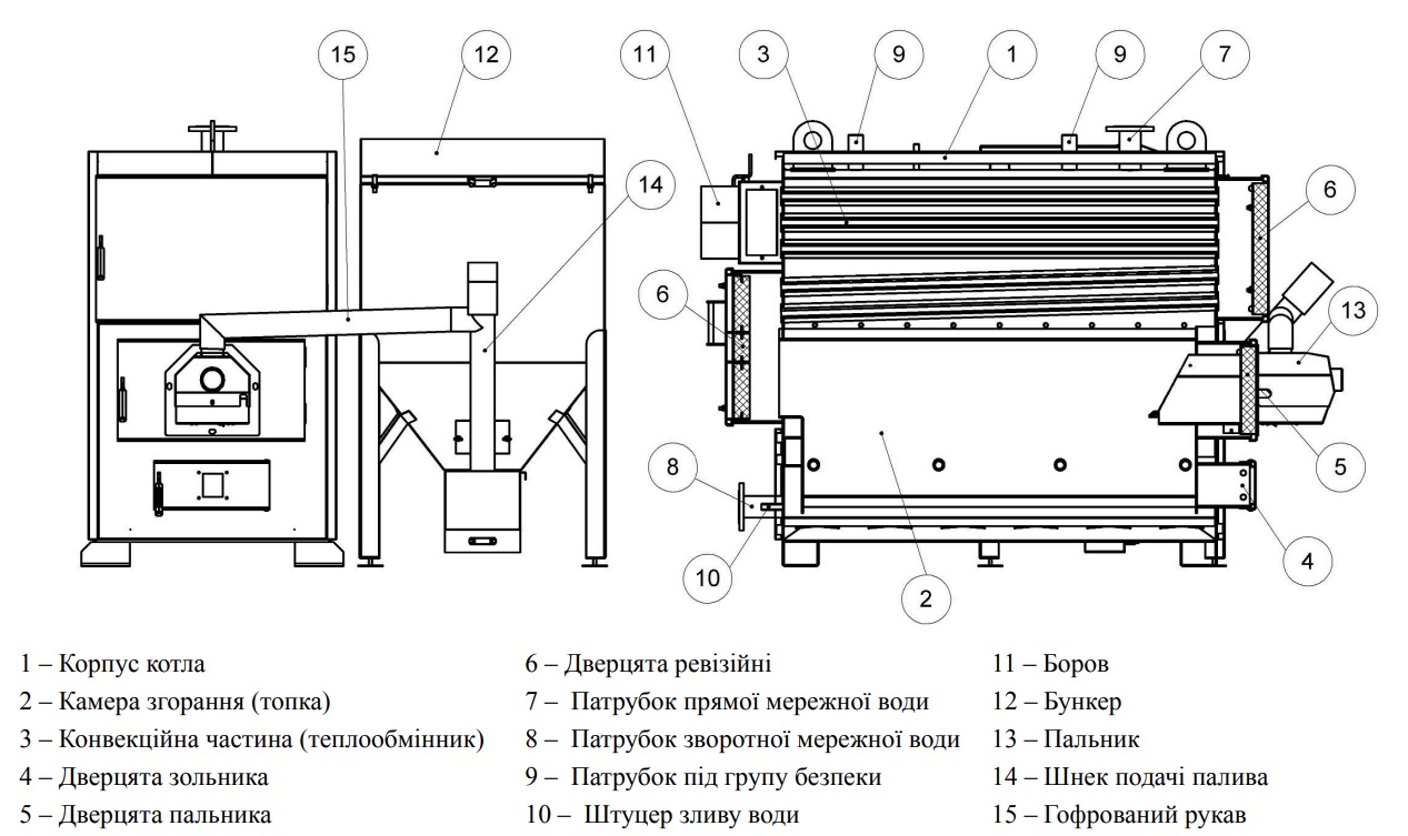 - Шнековий механізм подачі палива: гвинтовий пристрій, який автоматично подає паливо з бункера до пальника, приводиться в дію мотор-редуктором.