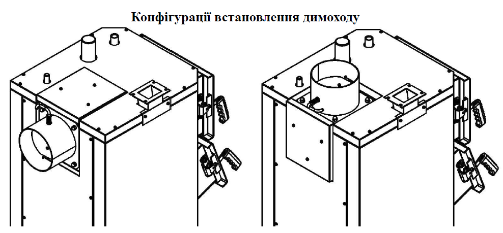 Однією з конструктивних переваг котлів серії KRONAS UNIC є можливість змінювати напрямок виходу димових газів завдяки універсальному виконанню борова. Конструкція передбачає обертання борова для налаштування димоходу у горизонтальній або вертикальній площині, що забезпечує гнучкість під час монтажу.