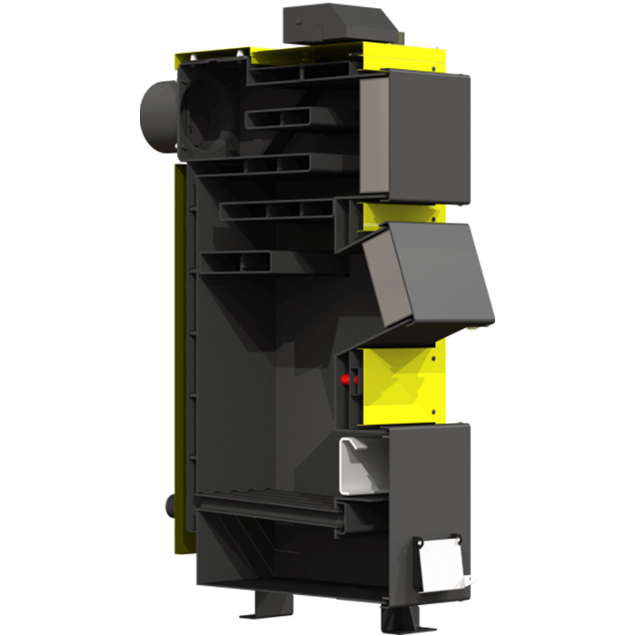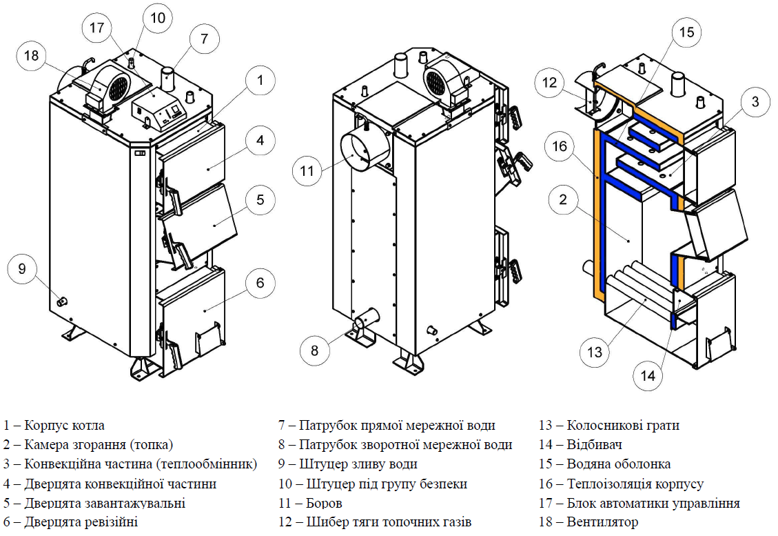 - Троє герметичних дверцят: для завантаження, чищення теплообмінника та доступу до колосників.