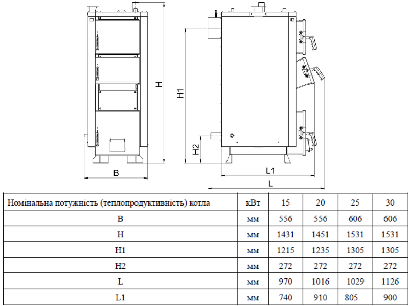 - Режим роботи — ручне завантаження, регулювання процесу горіння за допомогою механічного регулятора тяги