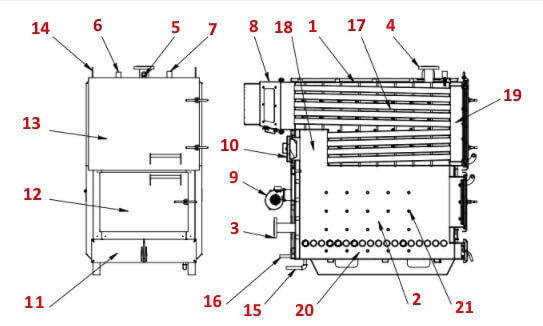 1 – Корпус котла; 2 – Топка; – 3 – Патрубок зворотної мережної води; 4 – Патрубок прямої мережевої води; 5 – Гільза для температурного датчика контролера; 6 – Патрубок під запобіжний клапан; – 7 – Патрубок під групу безпеки котла; – 8 – Димової патрубок; – 9 – Вентилятори нагнітання повітря; – 10 – Тил ревізійної люк; – 11 – Дверцята для чищення золи; 12 – Дверцята для завантаження палива; – 13 – Дверцята для чищення жаротрубного теплообмінника; – 14 – Такелажні вушка; – 15 – Патрубок для зливу конденсату; – 16 – Патрубок для зливу теплоносія; – 17 – жаротрубного пучок; – 18 – Перша поворотна камера; – 19 – Друга поворотна камера; – 20 – Зона збору залишків горіння; – 21 – Отвори подачі повітря.