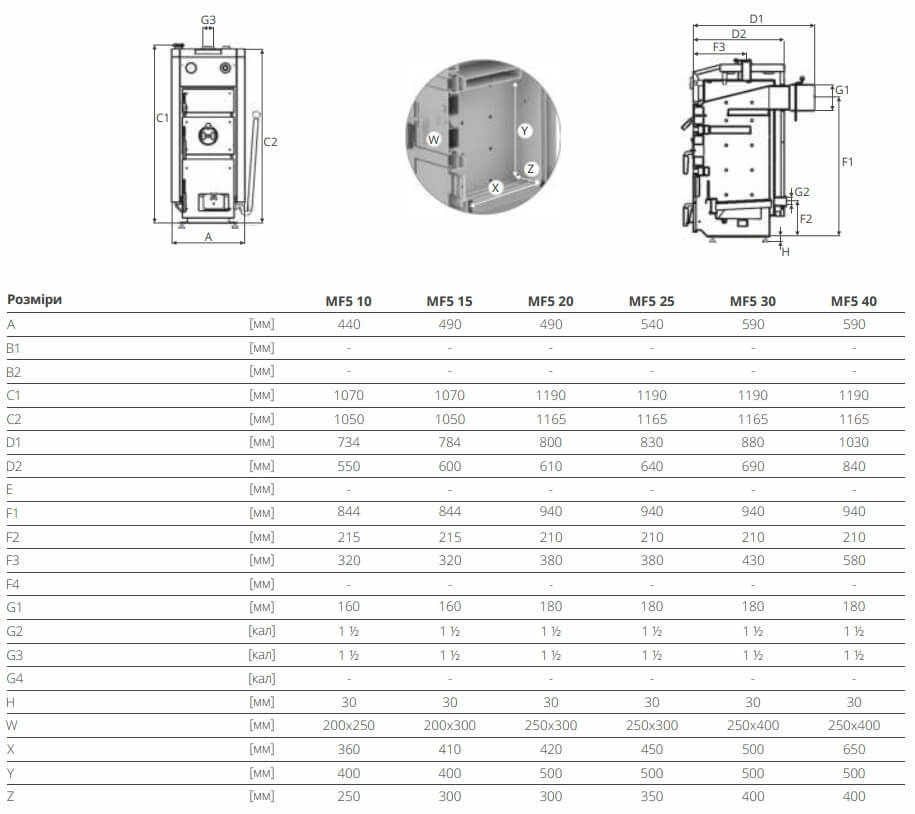 Котел MF5 працює на твердому паливі – дровах листяних порід і кам’яному вугіллі сорту ОІ. Для максимально ефективного горіння рекомендується використовувати дрова з вологістю не більше 20%, зокрема:
