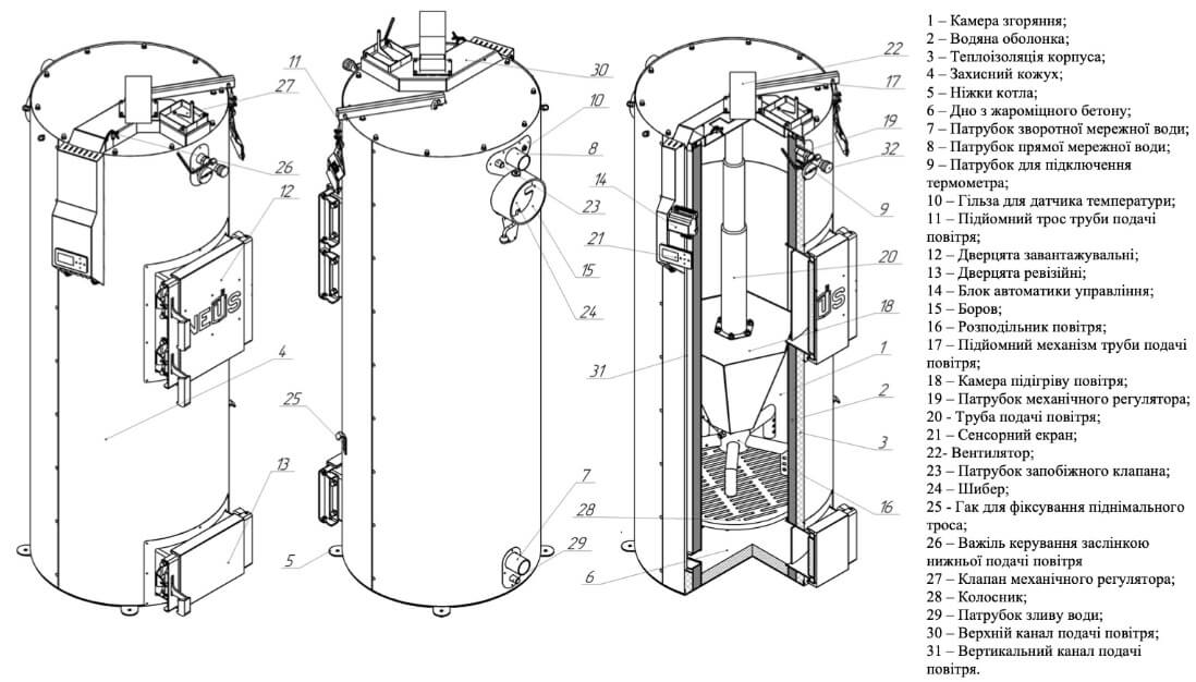 Котел складається з камери згоряння, системи подачі повітря, розподільника повітря, теплоізоляційної оболонки, захисного кожуха та димоходу. Камера згоряння має циліндричну форму з подвійною стінкою, між якими циркулює теплоносій. Завдяки цьому забезпечується ефективна передача тепла та зменшуються тепловтрати.