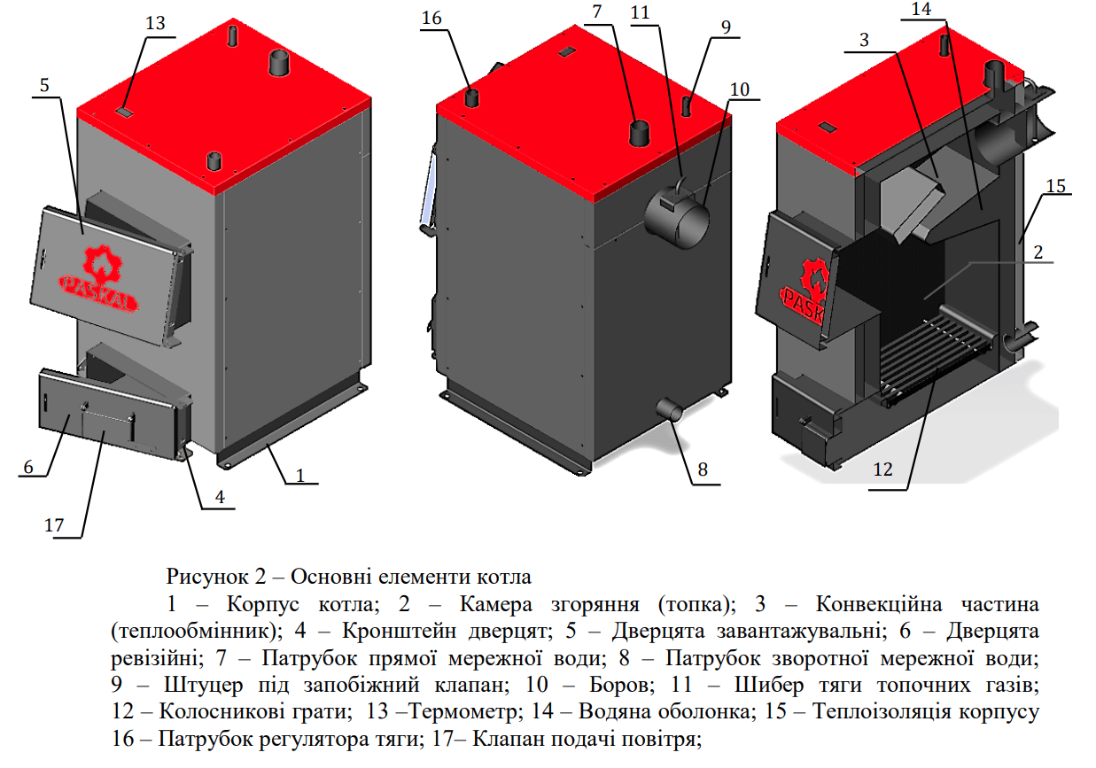 Котел виготовлений зі збірно-звареної жароміцної сталі товщиною 4 мм. Його будова включає: