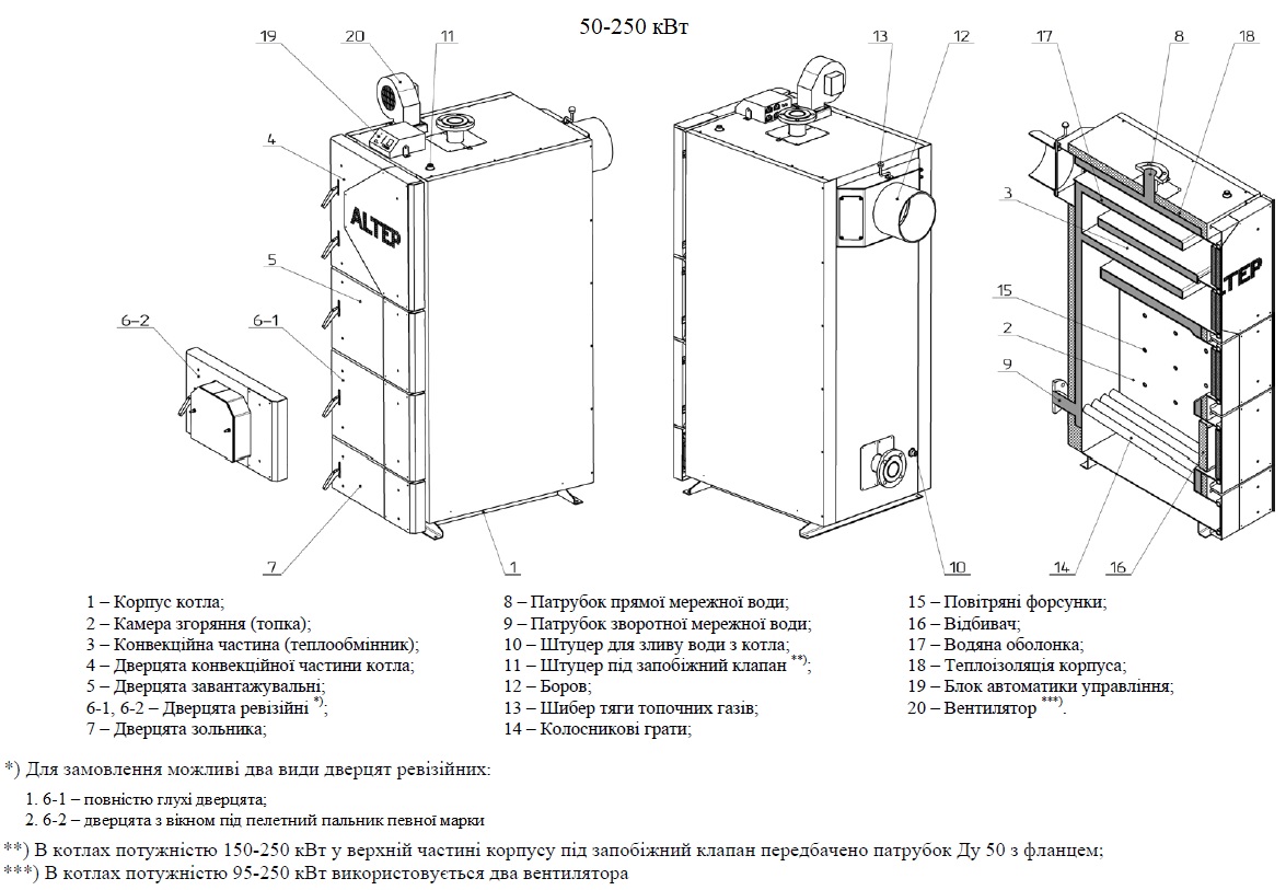 В базовой комплектации котёл работает с ручной подачей топлива. Однако конструкция предусматривает лёгкую адаптацию под автоматическую загрузку пеллет без изменения корпуса (выбор варианта дверцы согласовывается при заказе).