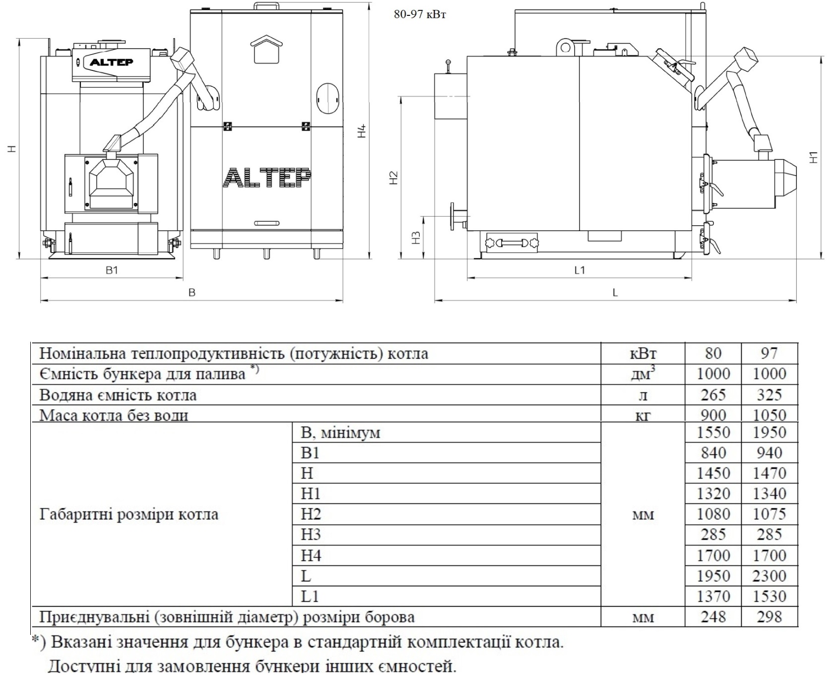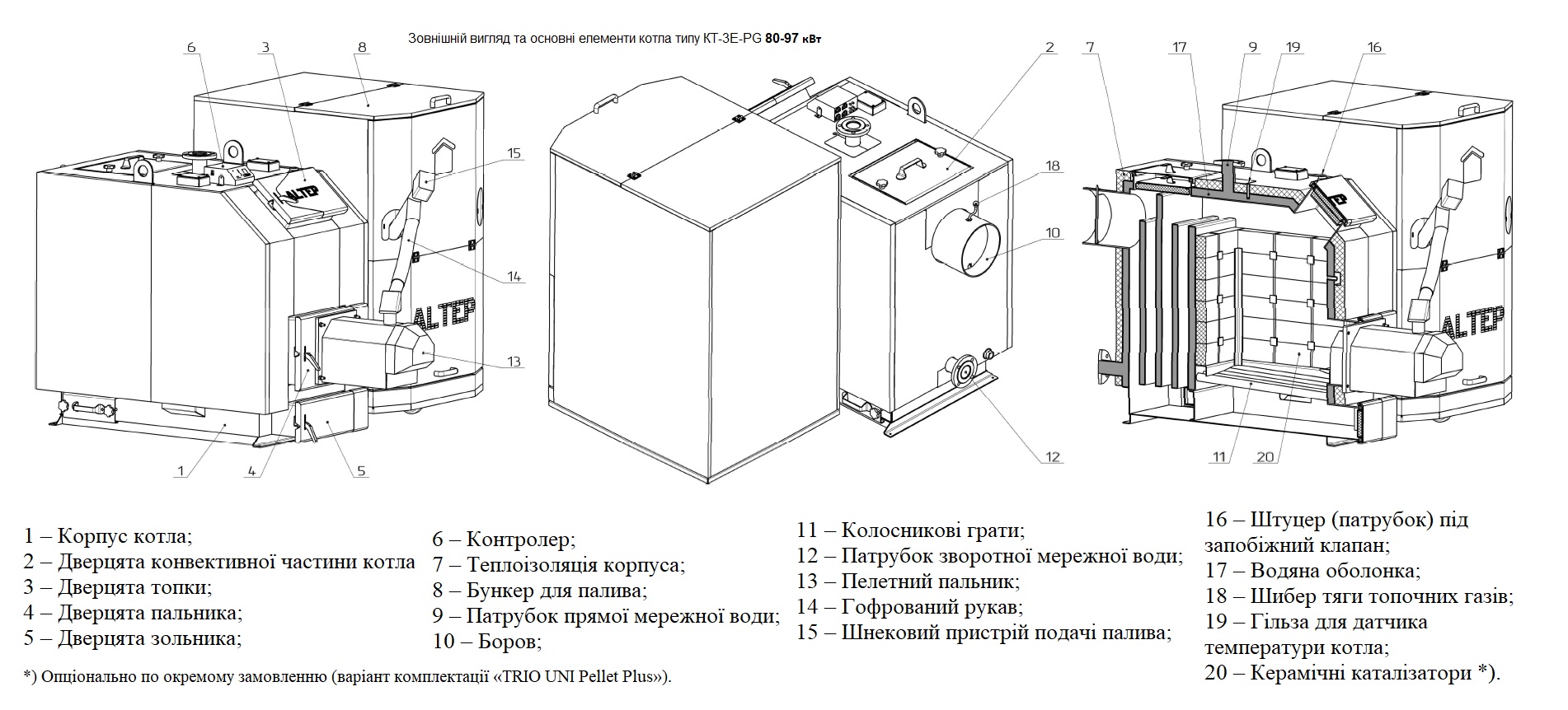 ALTEP TRIO UNI PELLET 97 кВт (АЛЬТЕП ТРИО УНИ ПЕЛЛЕТ) тип КТ-3Е-PG — пеллетный котел черниговского производства, который сочетает автоматическую подачу топлива и возможность ручной загрузки (опция). Предназначен для обогрева как жилых помещений, так и промышленных объектов.