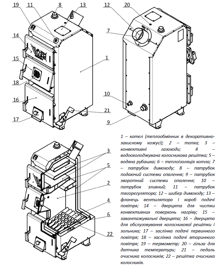 - Вентилятор — для принудительной подачи воздуха в топку.