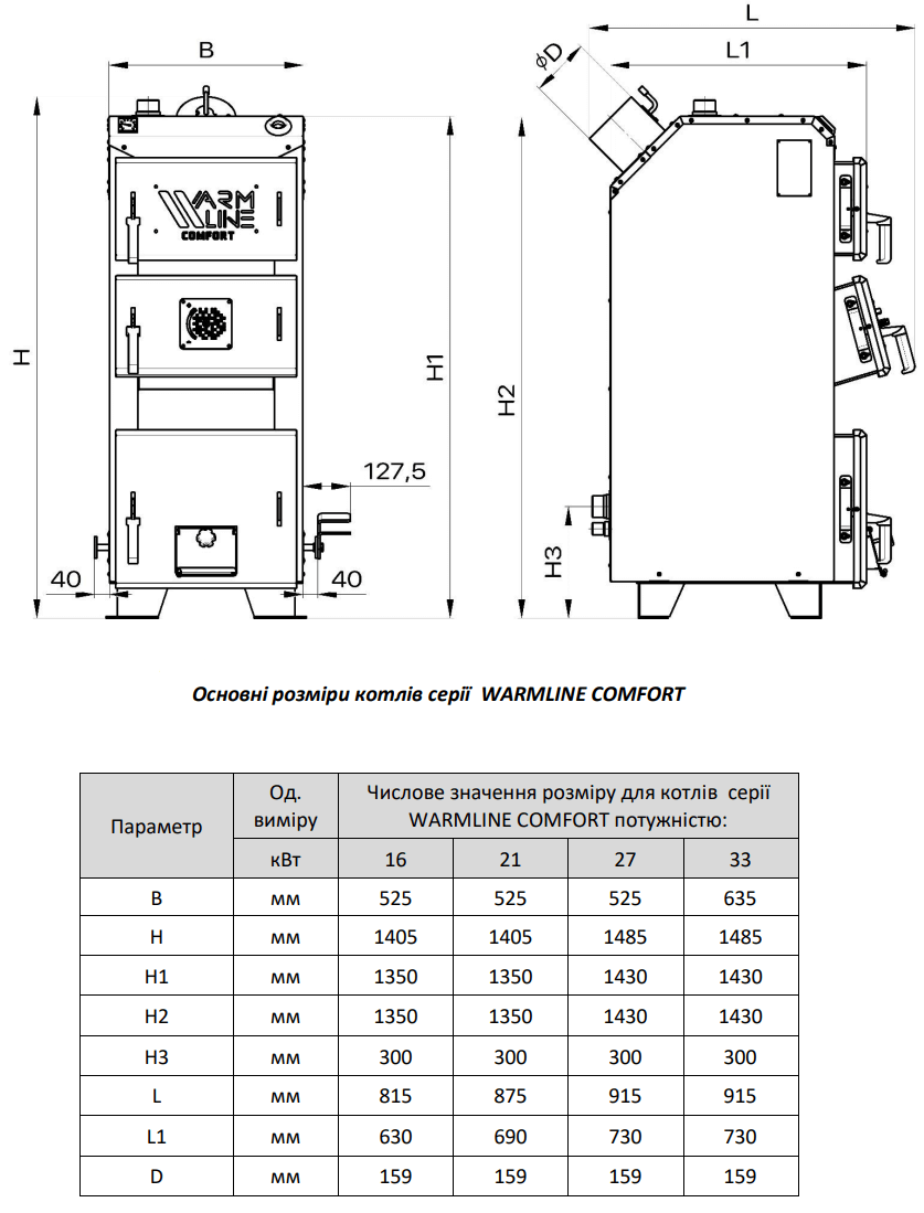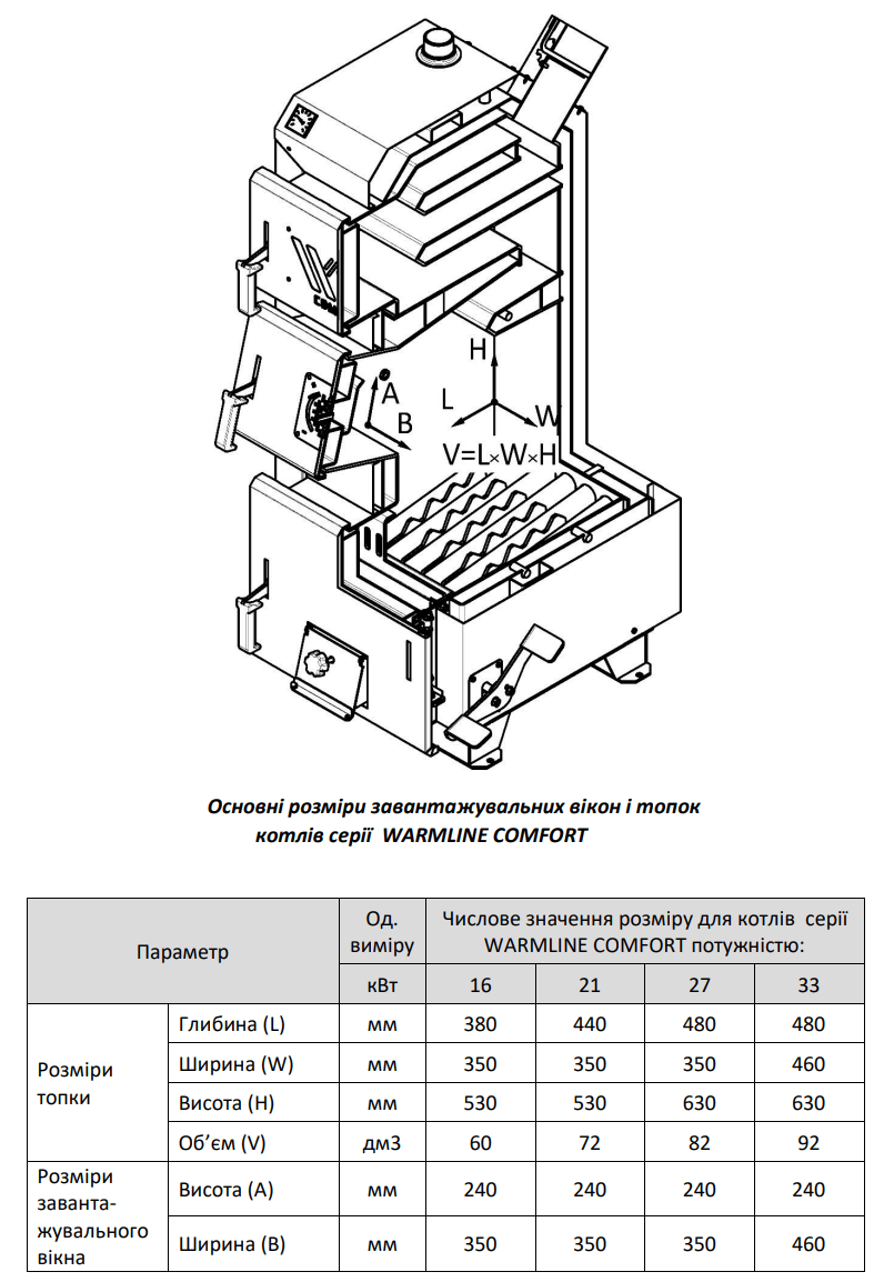 Основные размеры загрузочных окон и топок котлов Warmline Comfort