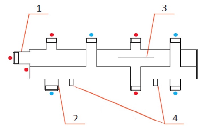 Увага! На фотографії показано розташування подаючих (червоні точки) та зворотних (сині точки) ліній на підключенні теплогенератора та контурів системи опалення.