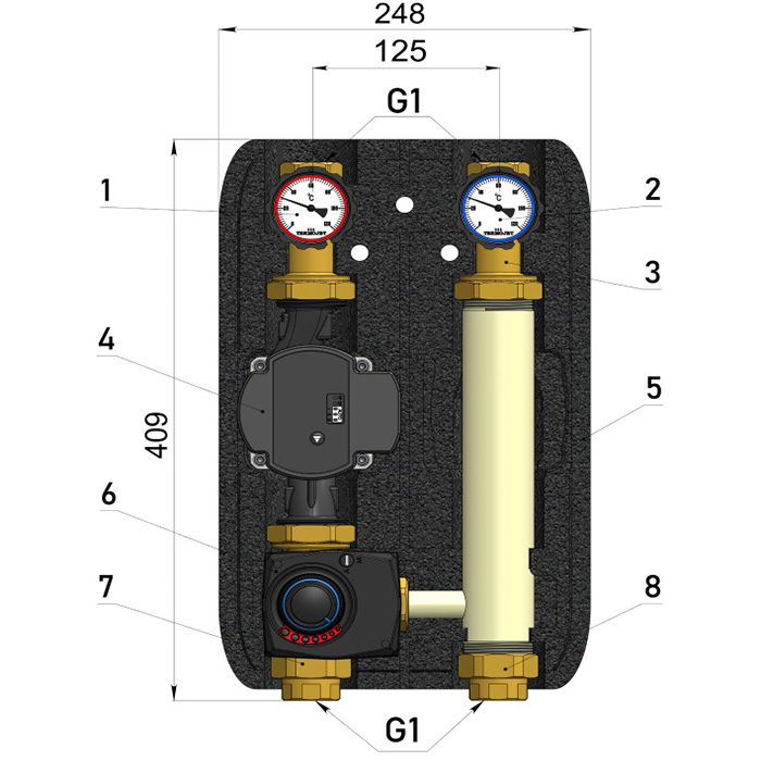 Завдяки вбудованому трьохходовому клапану з електричним сервоприводом на 220В, забезпечується точне та надійне змішування теплоносія для досягнення оптимальних параметрів роботи системи. Конструкція насосної групи включає крани з термометрами на лініях подачі та зворотної лінії (діапазон 0-120 °C), вбудований зворотний клапан та теплоізоляційний кожух, що мінімізує тепловтрати.