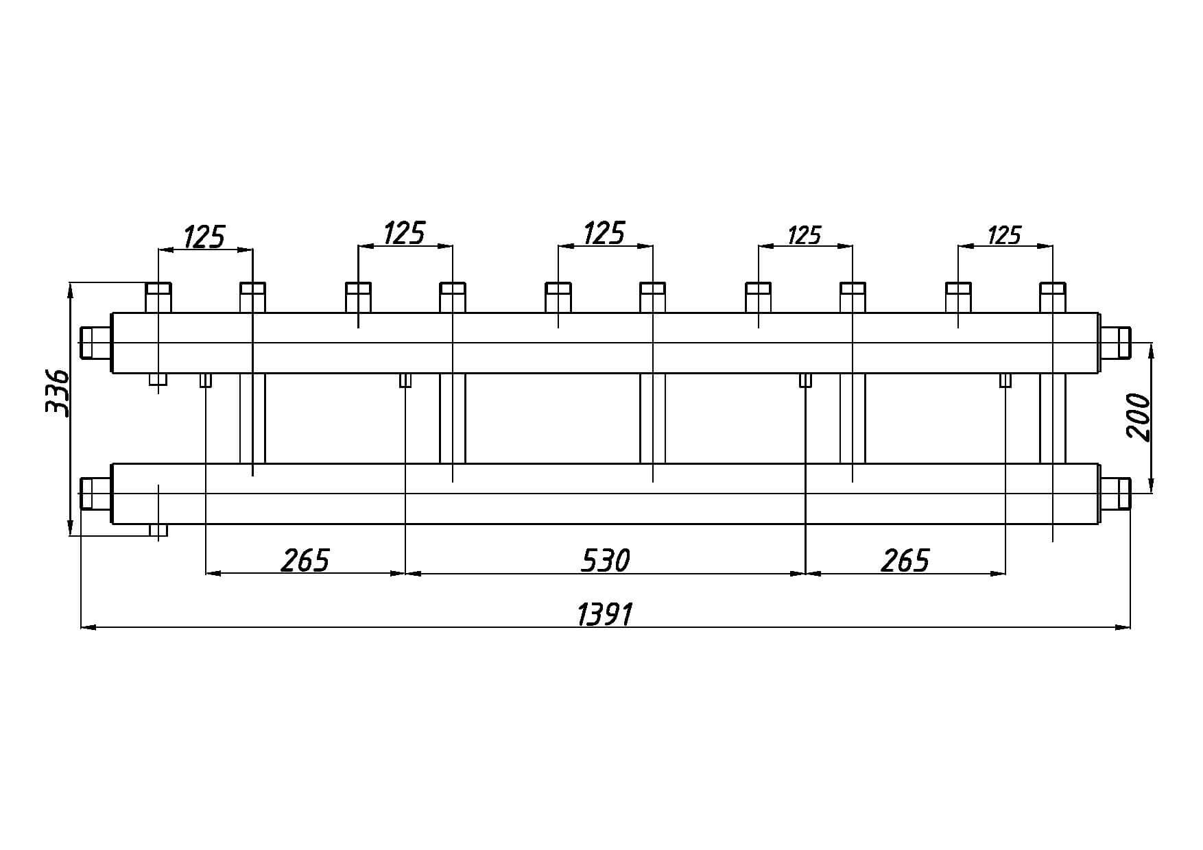 Колектор Termojet К52В.125 (200) укомплектований кріпленням до стіни. Міжосьова відстань патрубків підключення контуру споживача тепла дорівнює 125 мм.