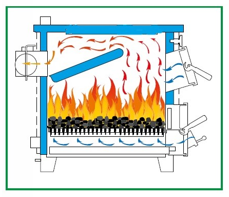 Димові гази проходять через систему вертикальних та горизонтальних полиць, що забезпечує ефективний теплообмін.