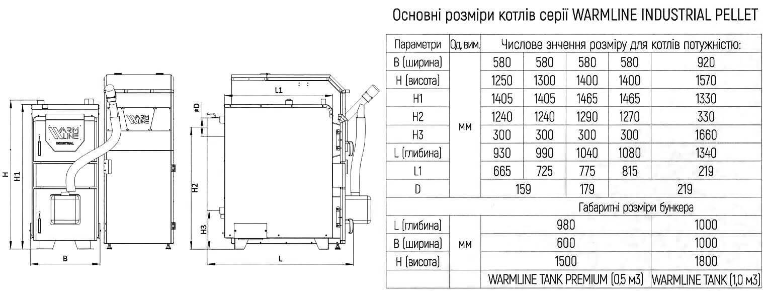 Схема і основні габаритні розміри пелетного котла WarmLine Industrial Pellet